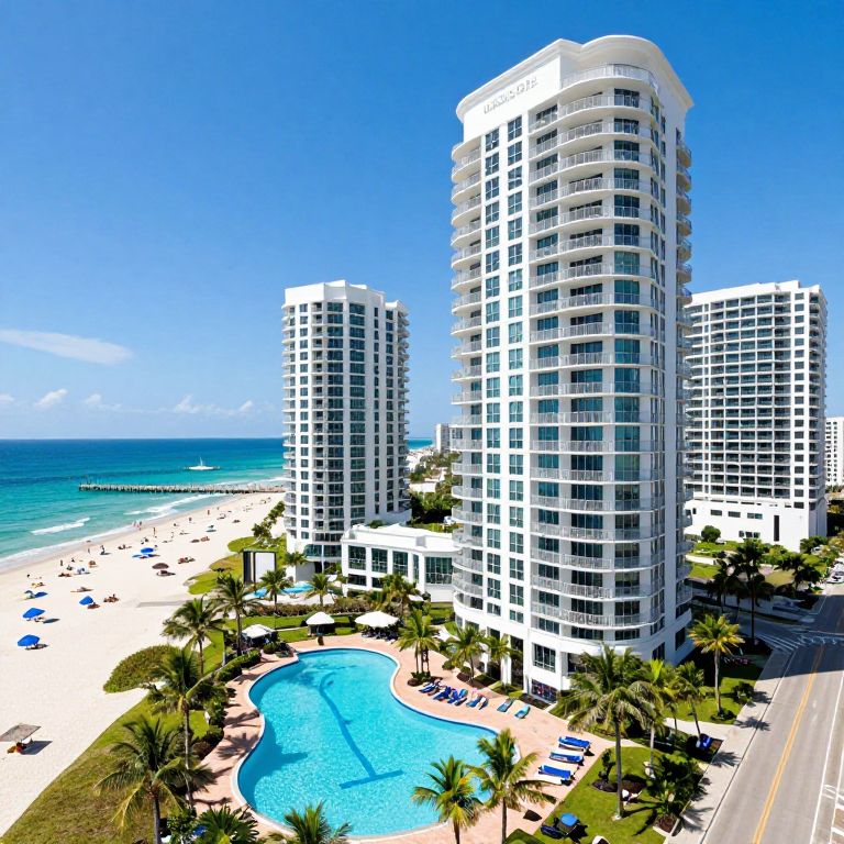 Modern high-rise condominiums rise majestically along Panama City Beach, featuring sleek white facades with expansive balconies overlooking turquoise waters, complemented by a vibrant lagoon-style pool, lush palm trees, and a well-appointed fitness center just steps away from Pier Park and the City Pier.