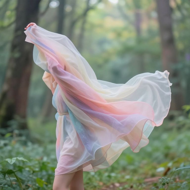 Clothing remove scene, a surreal artistic depiction of fabric gently floating away from a figure in a dreamlike forest, soft pastel colors blending with vibrant nature, ethereal atmosphere, intricate details on the textures of fabric and skin, high resolution