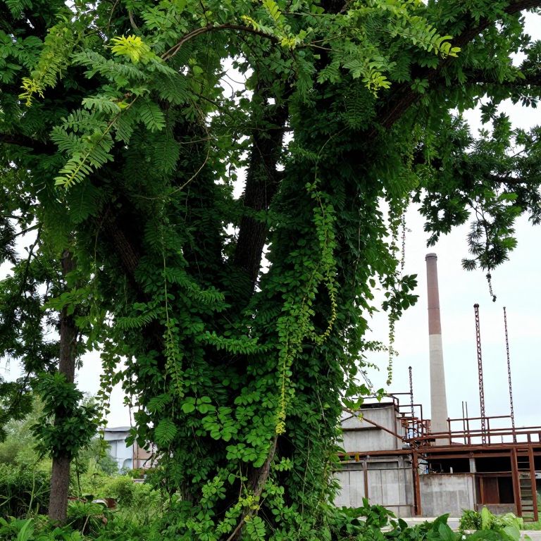 A realistic photograph showing a towering forest with dense green leaves and thick vines spreading naturally over ancient trees, contrasting sharply with a nearby industrial zone featuring rusted metal chains, concrete structures, and smokestacks, capturing the tension between organic growth and human-made machinery in a rural boundary landscape.