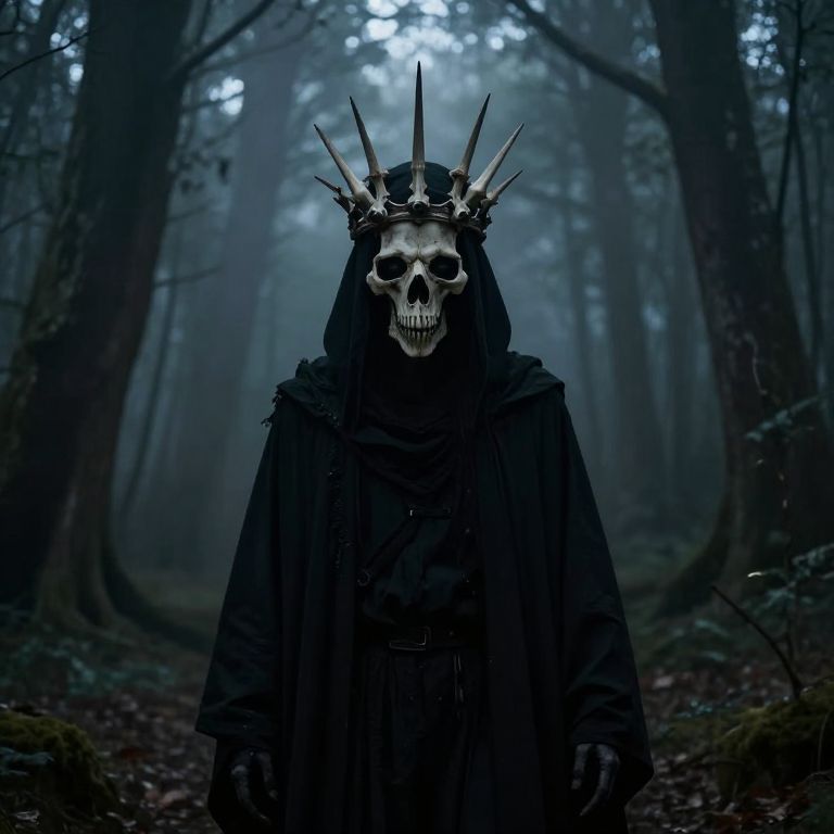 A mysterious figure with glowing eyes and a crown of bones stands amidst a misty, dark forest, evoking a sense of mythological terror and punishment.