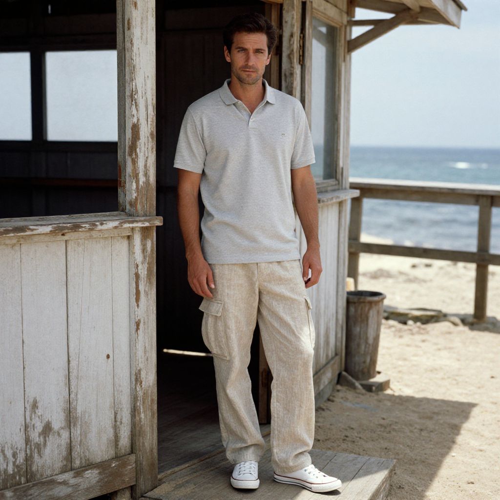 A man, light grey organic cotton polo, beige hemp cargo pants, white canvas sneakers, coastal seafood shack, weathered wood, ocean breeze, relaxed expression, kodachrome analog film. Man has masculine face and piercing eyes