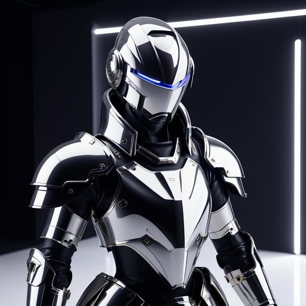 High-detail image of a stoic robot wearing sleek, futuristic armor inspired by Balenciaga. The armor features luxury metallic materials with segmented plating and smooth, sharp edges, illuminated by cinematic professional studio lighting against a dark background with vertical light strips. The robot's design combines advanced robotics and high-fashion aesthetics, showcasing highly polished, reflective surfaces and sophisticated articulation.