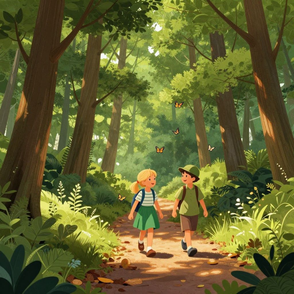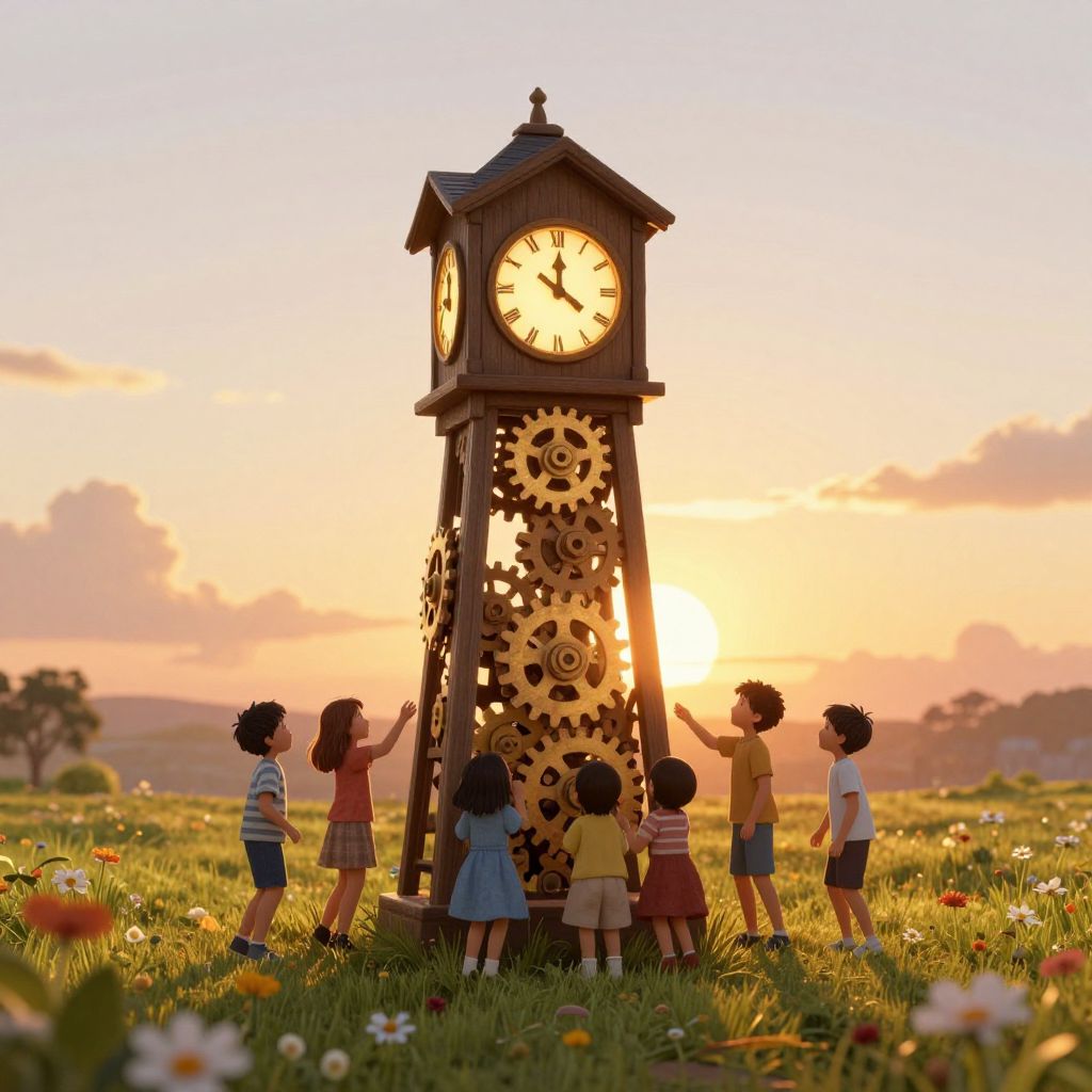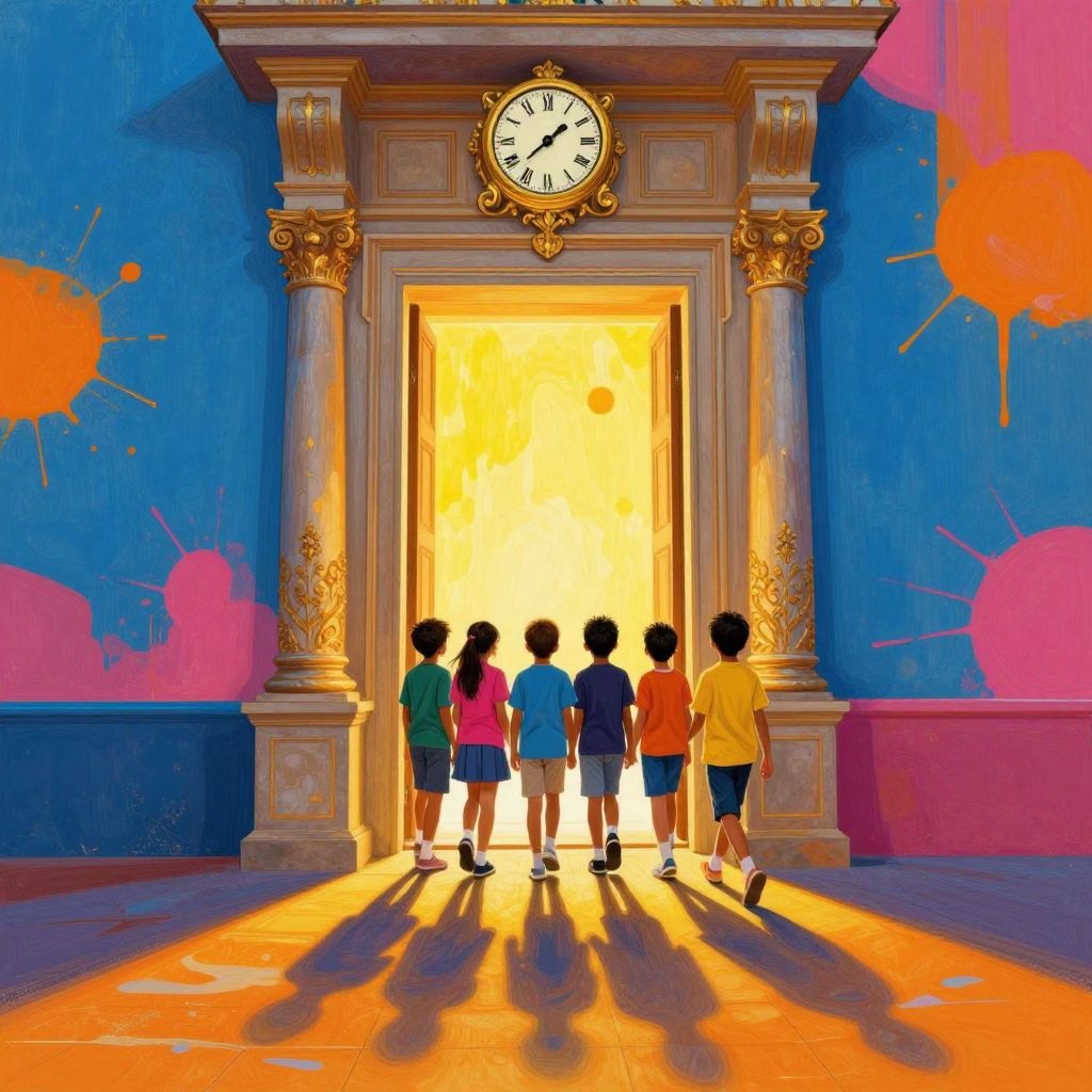Digital art depicting three children standing in front of a grand, open doorway bathed in bright, golden sunlight. Above the doorway, a large, ornate clock shows the time as 4:10. The children, silhouetted against the light, are a girl in a red dress, a boy in a yellow shirt, and another boy in a blue shirt. A white, flowing ribbon or piece of paper floats to the right. The doorway has classical architectural elements, with columns on either side. Shadows of the children stretch across a stone-paved floor, adding a dramatic effect. The overall style is vibrant and whimsical.