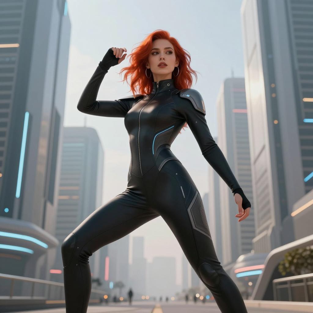 A confident woman with vibrant red hair strikes a dynamic pose against a futuristic cityscape. Her sleek, form-fitting outfit reflects the stylish design of this imaginative environment, emphasizing the harmony between fashion and technology. This image captures a sense of empowerment and adventure in an extraordinary setting.