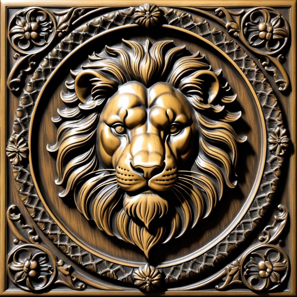 Beautiful engraving on a plaque, with no text, polyptych, featuring a beautiful lion with high detail.