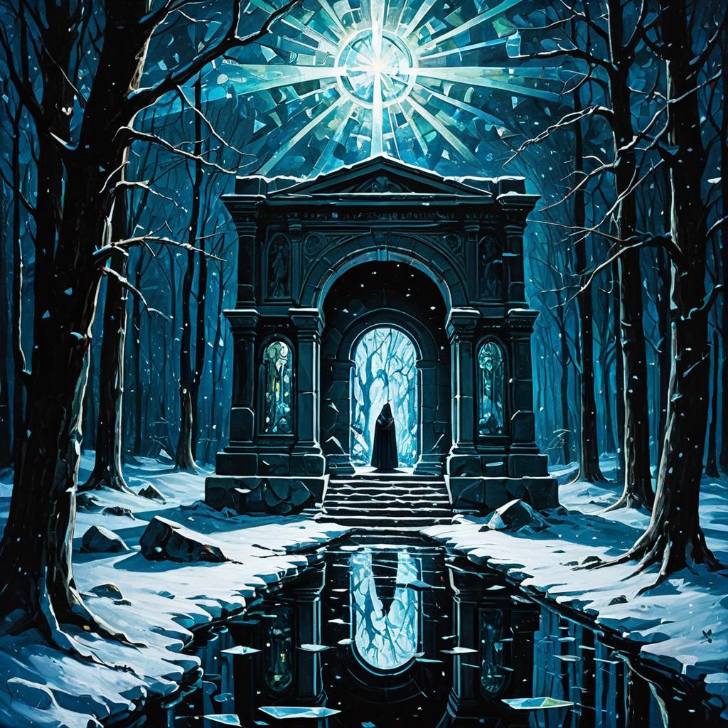 A mystical winter landscape featuring a snow-covered forest illuminated by two glowing orbs resembling a lantern and moonlight. The scene shows a reflective icy stream flowing through the center, surrounded by leafless trees with golden accents. The image combines vivid blue and warm yellow tones with volumetric light effects, heavy brush strokes, and a unique painterly style inspired by classic and modern art influences.