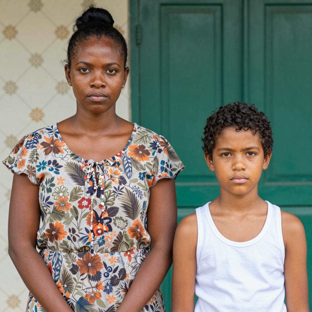 Group photograph of five people standing outdoors in front of a worn, industrial building with barred windows. From left to right: blonde man with short hair, wearing dark shirt and light pants, holding a stick, serious expression; young girl with dark hair in a striped shirt, neutral expression; older man with gray hair, light jacket, neutral expression; Black man with dark hair, floral shirt, crossed arms, serious expression; older man with white hat, white tank top, neutral expression. Grassy ground, two large doors in background. Sepia tone.