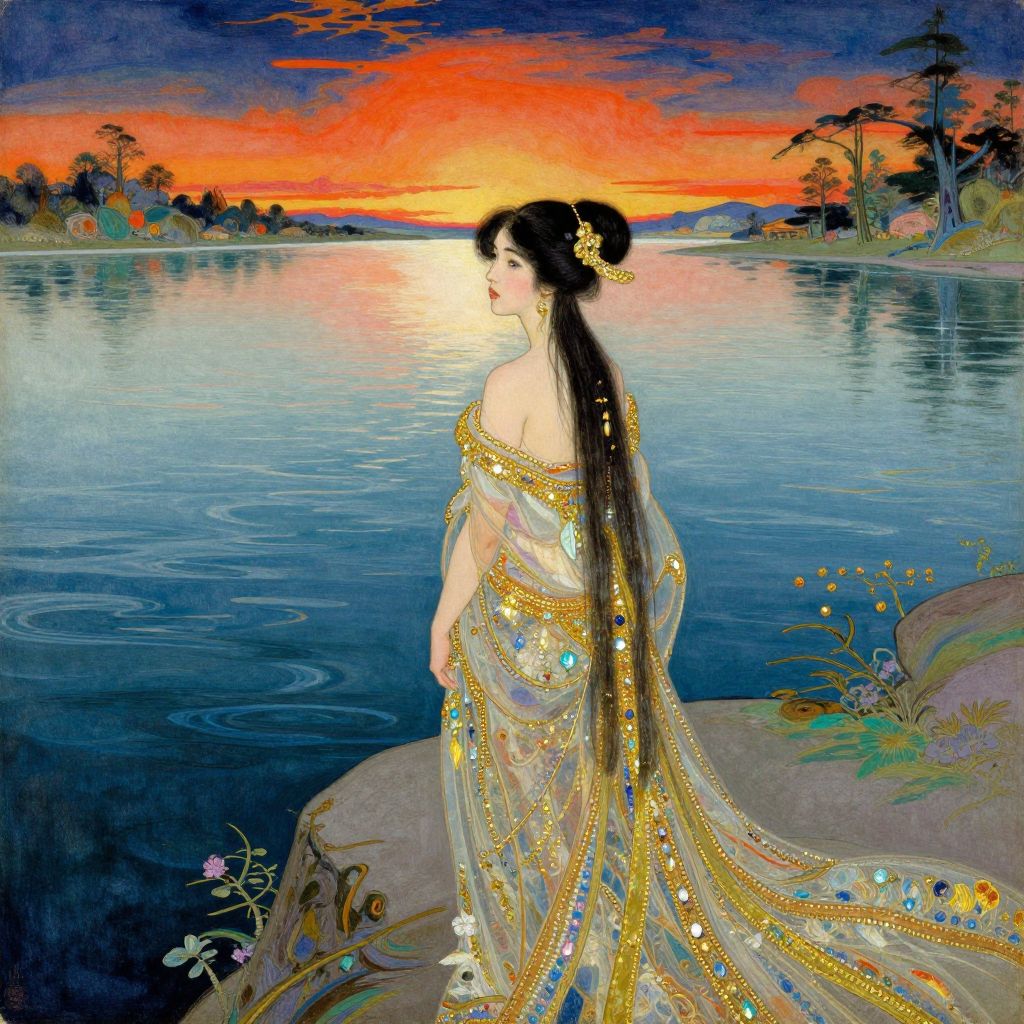 Craft an image imbued with the captivating allure of a Waterhouse-inspired masterpiece, seamlessly blended with the dynamic vigor of Japanese ukiyo-e prints. Depict a mesmerizing woman poised at the precipice of a glistening lake, her presence exuding ethereal grace as she gazes towards the distant horizon. Adorned in an elaborate gown embellished with golden embroidery and shimmering jewels, her flowing tresses cascade down to her waist. Capture this enchanting scene from an unconventional bird's-eye view, highlighting both the tranquil splendor of the surrounding environment and the profound emotions conveyed through the lady's pensive expression. This evocative image should stir a sense of yearning, enigma, and awe, rendered in a kaleidoscope of vibrant hues and fluid brushstrokes that seamlessly intertwine the fantastical with the familiar, resulting in an unforgettable visual tapestry.