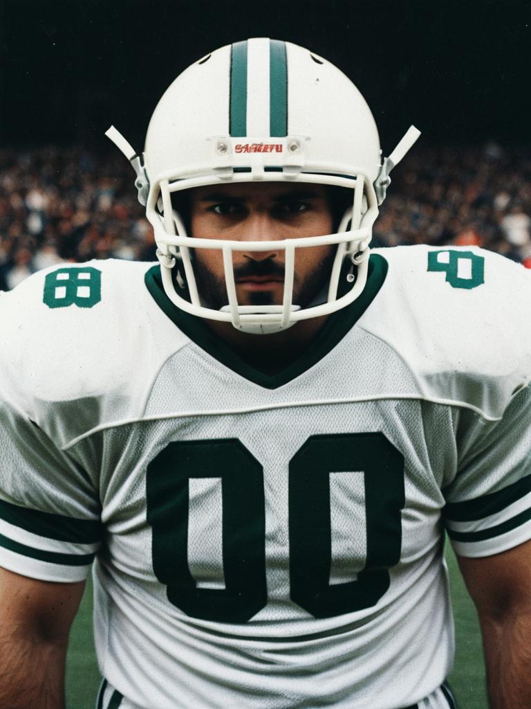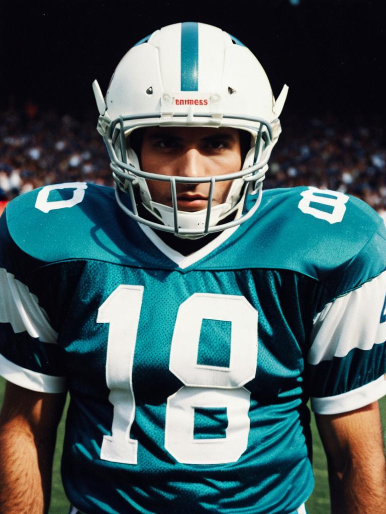 Man in Football Jersey Costume, waist-up editorial portrait, photorealistic tones