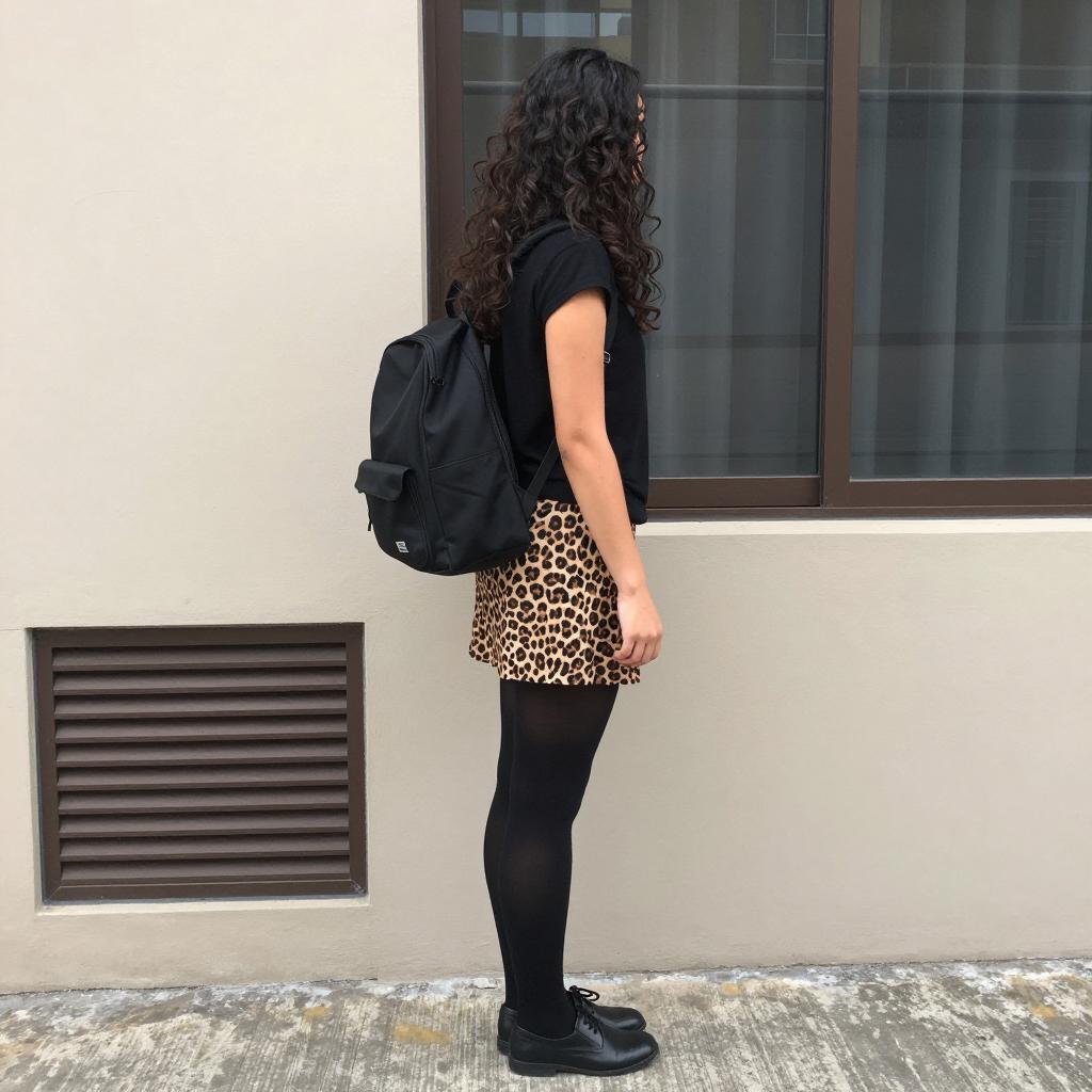 Photograph of a young woman with long, curly black hair standing in profile. She wears a black short-sleeve top, leopard print skirt, black tights, and black shoes. A black backpack is on her back. She stands in front of a beige wall with a brown vent and a large window. Her reflection is visible in the window. The ground is gray and slightly ured.