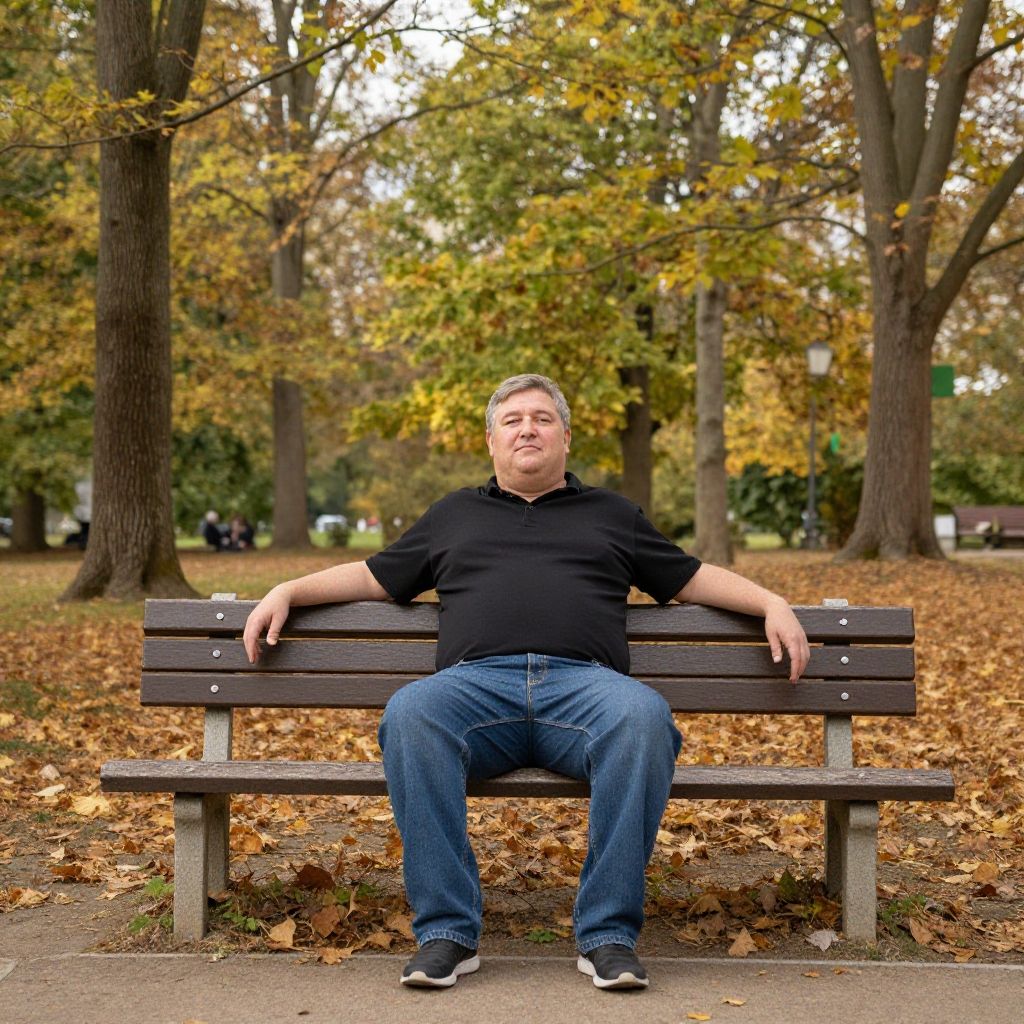 A tall fat man sitting on a park bench, surrounded by autumn leaves, soft natural light, warm color palette, photorealistic, peaceful outdoor scene