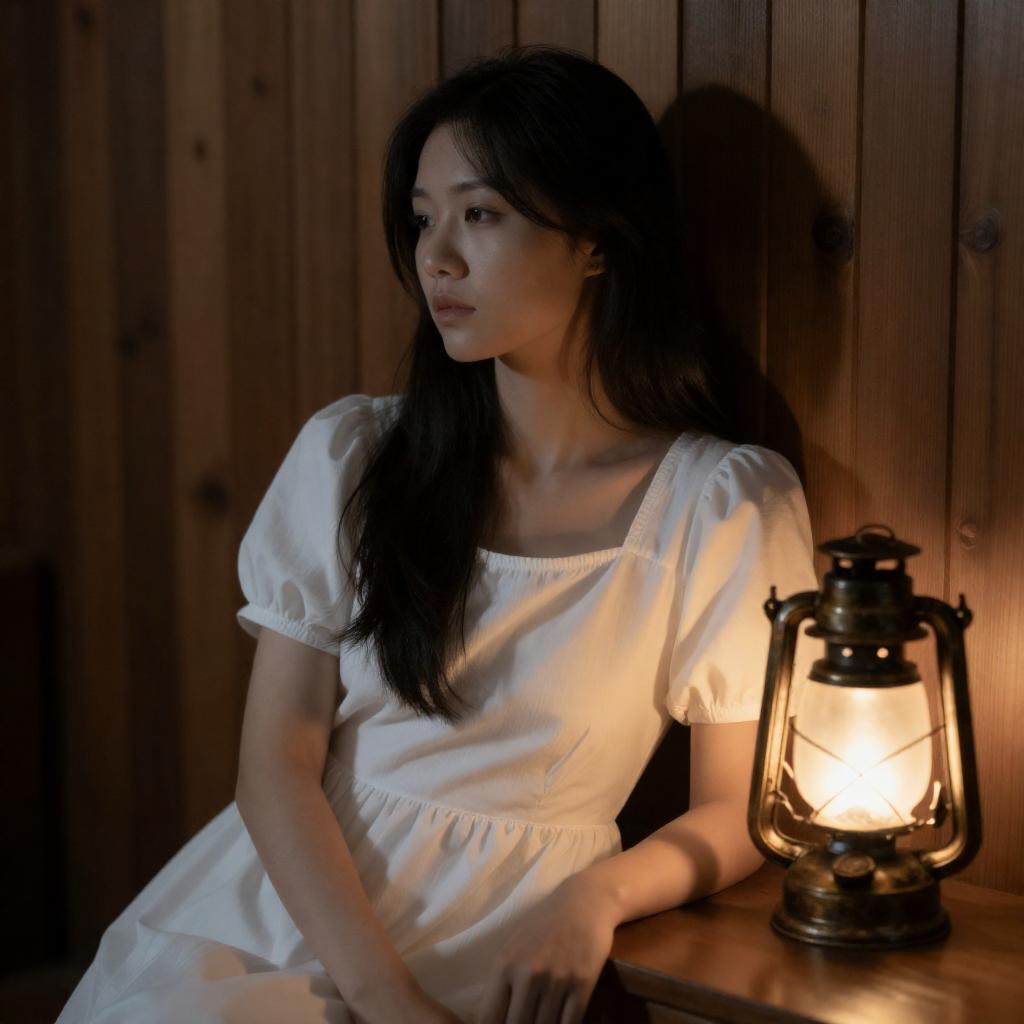 Photo of three Asian women standing outdoors at night. The woman in the center has short dark hair, is wearing a brown top and blue jeans, and holds a glowing vintage orange lantern that illuminates their faces. The women on the left and right have long dark hair; one wears a black top and jeans, the other a striped shirt tied at the waist with black pants. The background is dark with faint greenery visible.