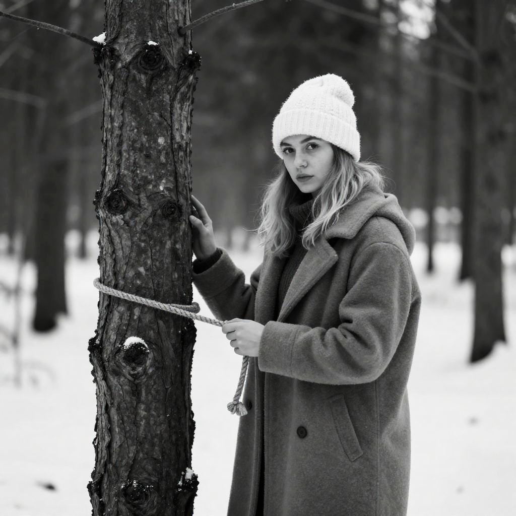 Black-and-white photograph of a young woman with blonde hair and a white knit hat, wearing a thick, ured coat, standing in a snowy forest. She is holding a rope tied around a tree trunk. Background shows tall, dark trees with snow on the ground. Her expression is neutral, looking slightly to the right. She is positioned to the right of the tree.