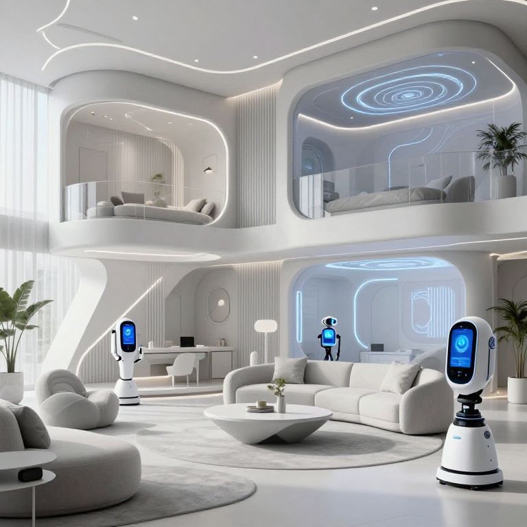 Futuristic homes interior designed with a monochromatic palette, geometric furniture, smart robotics assisting daily tasks, virtual reality zones, kinetic lighting effects, and seamless connectivity devices enhancing a streamlined and efficient living environment.