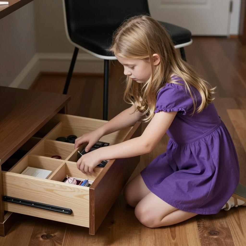Young girl with long blonde hair, wearing a purple dress, kneels on wooden floor, reaching into an open wooden drawer. Drawer has multiple compartments with visible contents. Black chair with white trim in background. Dim lighting.