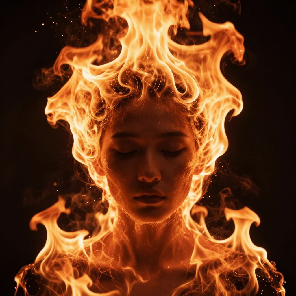Photograph of a young woman with closed eyes, surrounded by intense, vivid orange and yellow flames against a black background. Her face is partially obscured by the fire, which frames her head and neck, creating a dramatic and almost ethereal effect. The flames have bright, sharp edges with curling tendrils, and her skin is illuminated by the fire's glow, highlighting her serene expression. The contrast between the dark background and the bright flames enhances the image's intensity and focus on the woman's calm demeanor amidst the fiery surroundings.