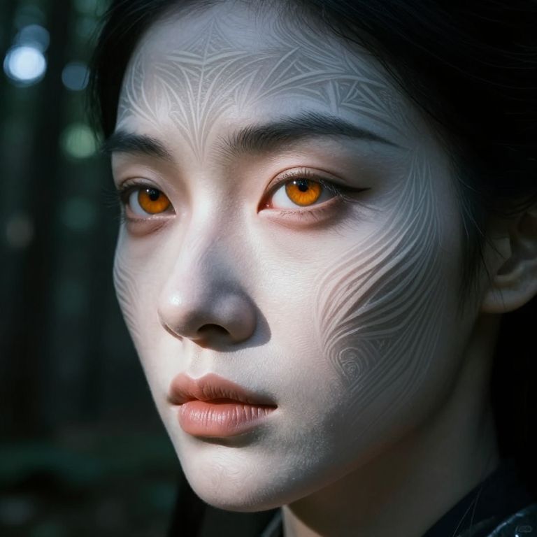A digital camera captures the enigmatic aura of an East Asian shapeshifter amidst a dense forest. Piercing amber eyes, reflecting wisdom and intrigue, gaze into the distance with a mysterious resilience. Ethereal moonlight filters through the canopy, casting subtle shadows across angular features and illuminating intricate patterns etched onto pale skin - a fusion of ancient tribal markings and modern geometric designs. This close-up view offers an unusual bird's-eye perspective, showcasing every detail from finely sculpted brows to delicately curved lips.