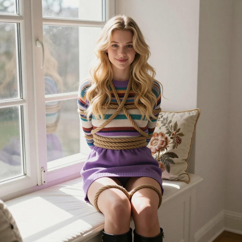 A photograph of a young woman with long, wavy blonde hair, bound tightly with rope in a shibari style. She sits on a white window seat with purple cushions, wearing a purple and black striped sweater and black boots. Sunlight streams through the window, illuminating the cozy room with plants and decorative pillows in the background.