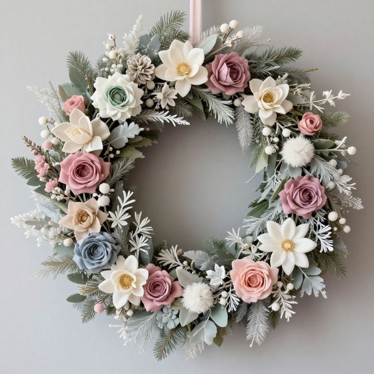 An ethereal embrace of serenity and nostalgia, this pastel-hued wreath whispers the quiet magic of winter, inviting the viewer into a world where soft textures, delicate scents, and timeless beauty converge in a gentle dance of holiday wonder.