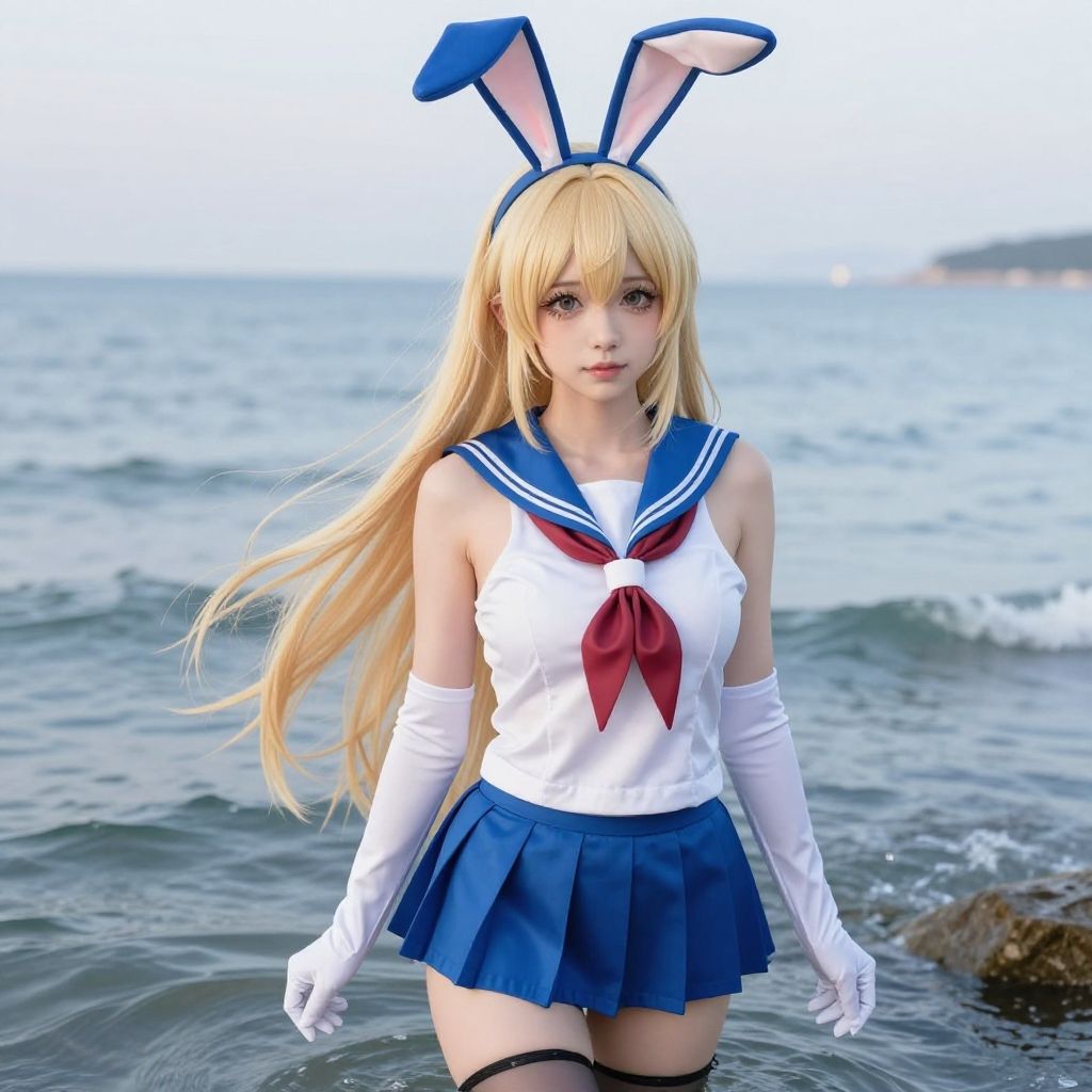 Digital anime artwork of a blonde, blue-eyed girl with bunny ears, wearing a black sailor uniform and white gloves, standing in the ocean.