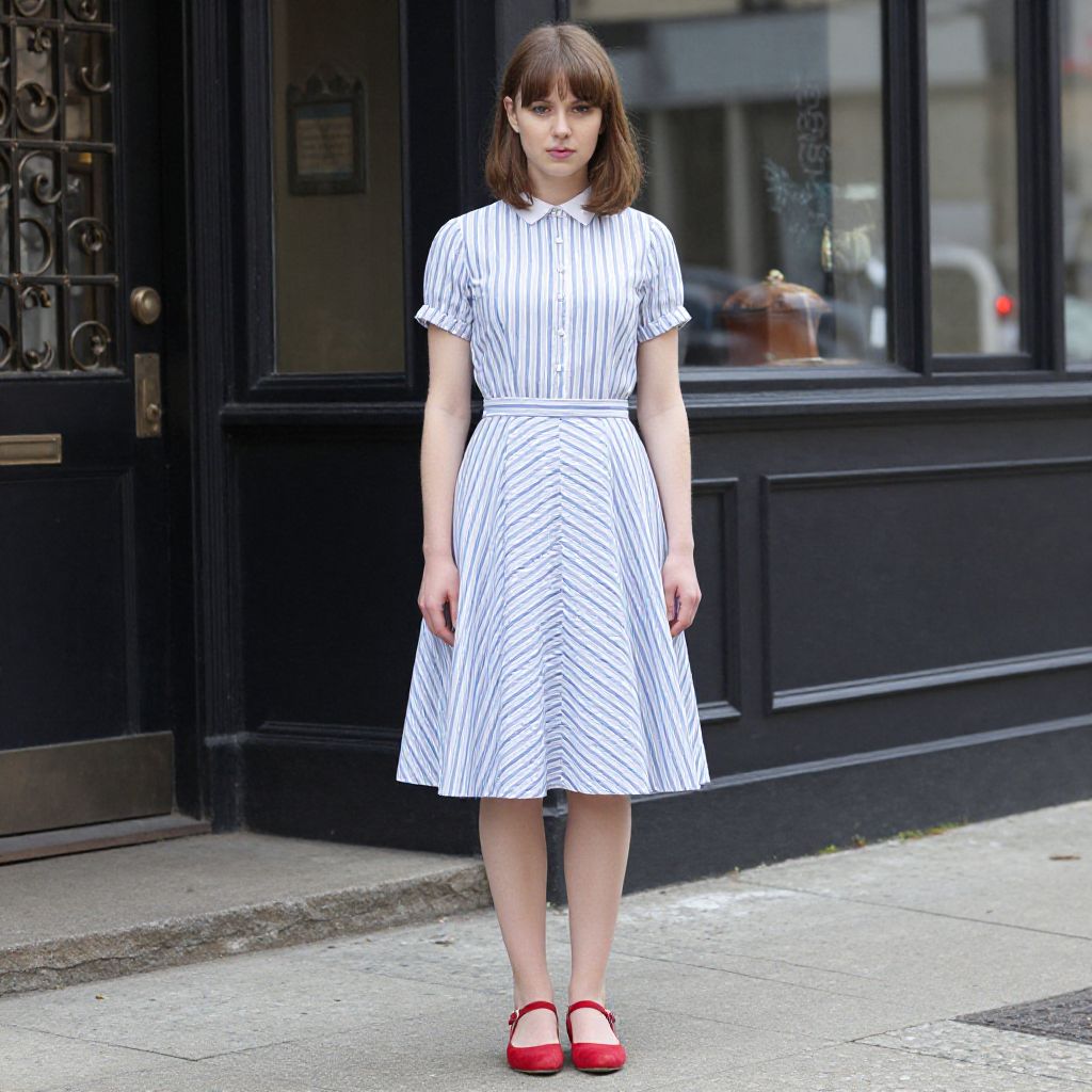 Photograph of a young woman with straight brown hair, wearing a white pinstripe dress and red Mary Jane shoes, standing on a city sidewalk in