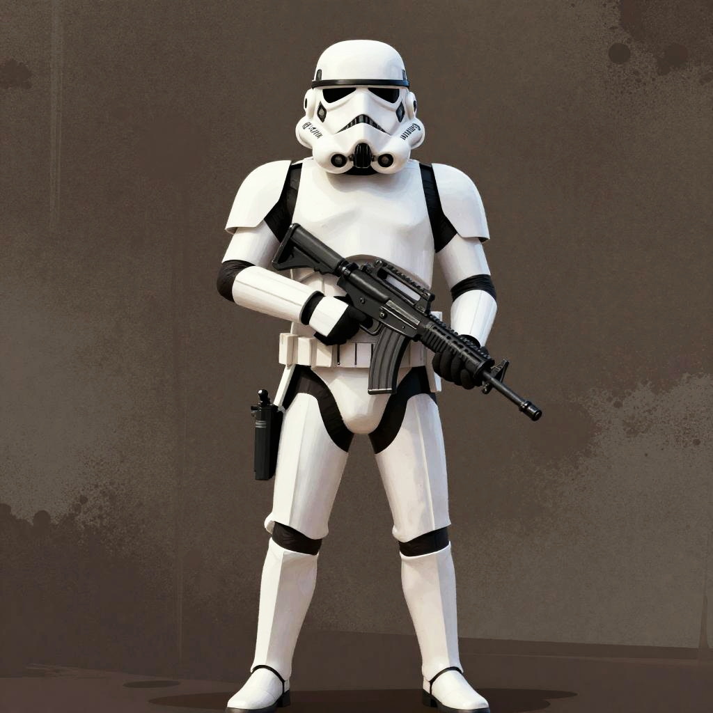 Digital illustration of a white and black Stormtrooper standing, holding a rifle, against a textured dark brown background.