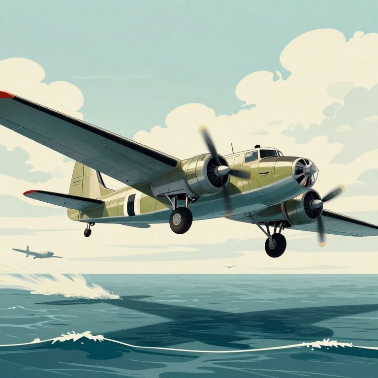 A digital illustration of a WWII-era, olive-green military bomber aircraft with four propellers, flying over a vast ocean. The plane, with a round nose and extended wings, casts a shadow on the blue, slightly choppy water below. The sky is bright with scattered white clouds. The bomber's details, including visible rivets and a red-tipped tail, are rendered in a semi-realistic, comic-book style. The illustration uses bold lines and vibrant colors, emphasizing the dynamic motion and historical context of the aircraft.