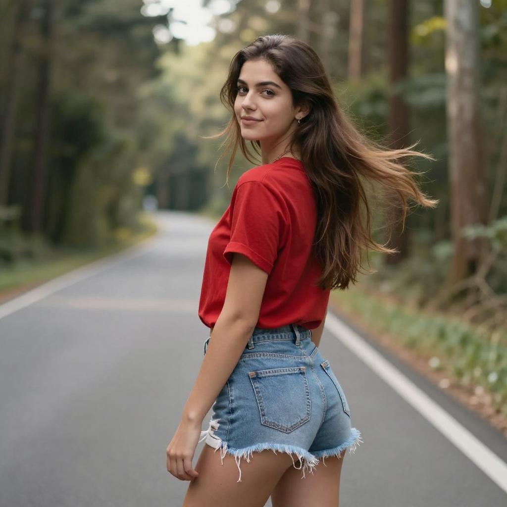 Photograph of a young woman with long brown hair, wearing a red t-shirt and frayed denim shorts, standing on a forest road. She looks over her shoulder with a slight smile, her hair blowing in the wind. The background is blurred with tall trees and sunlight filtering through.