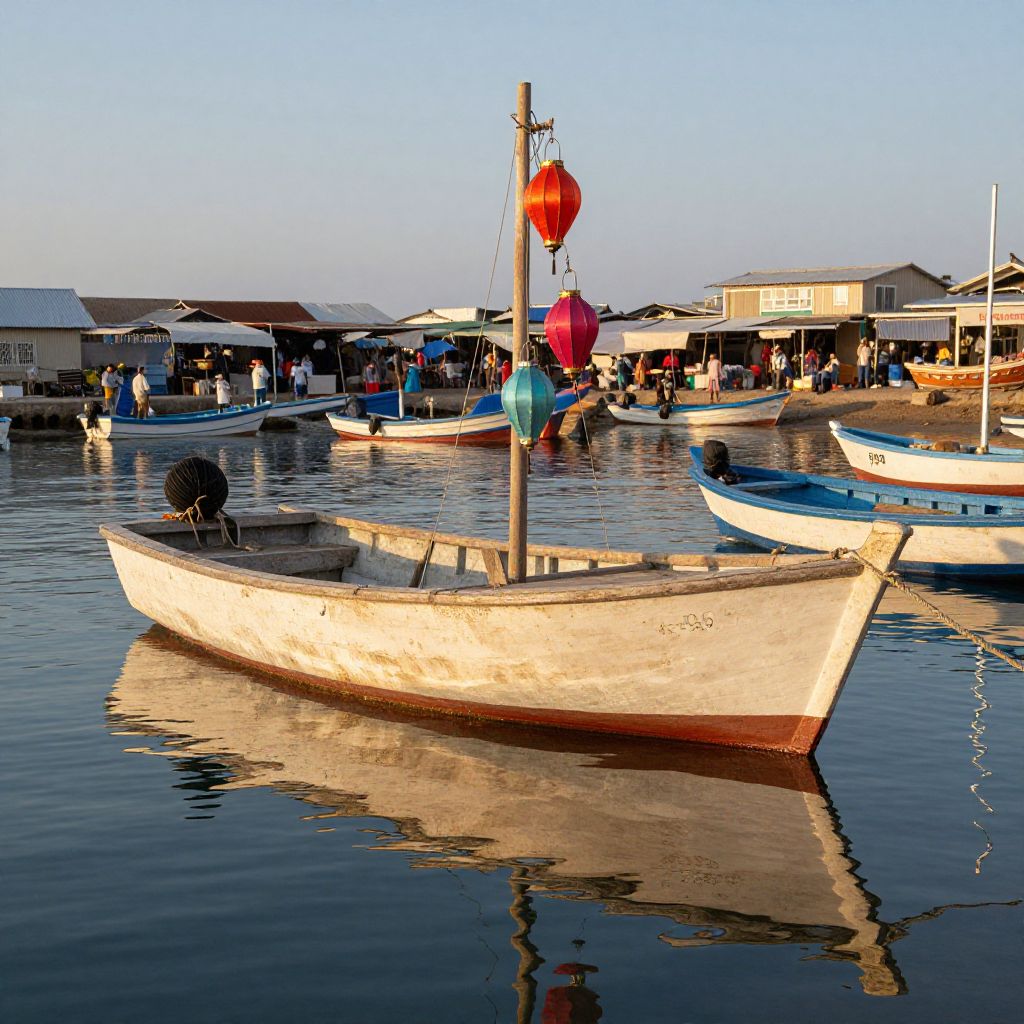 Perot boat moored at an old harbor during golden hour, detailed reflections on the water, weathered wood and colorful lanterns hanging from the mast, bustling seaside market in the background with fishermen and boats, warm and inviting coastal atmosphere.
