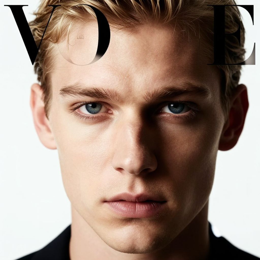 Close-up portrait of male model blonde hair with piercing blue eyes, high contrast lighting, minimalist background, fashion magazine cover style, sharp focus on facial details