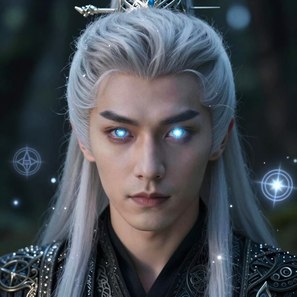 Close up of a mystical mage with silvery white hair, eyes glowing with power, arcane symbols floating around, dark enchanted forest background, magical energy radiating from hair tips, detailed facial features, high contrast with luminous silver highlights on hair.