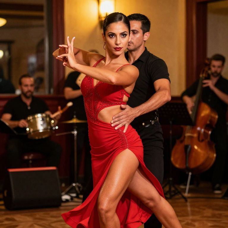 A striking Argentinian tango dancer in her late 20s with sun-kissed skin, expressive dark eyes, and a strong, defined face, wearing a fiery red tango dress with a sensual slit that reveals her toned legs and midriff, dancing with passion in a traditional tango venue in Rosario, the setting bathed in warm golden light and the sound of live band music, capturing the raw emotion of the dance.