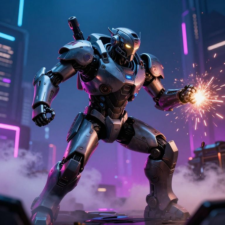 Cybernetic warrior in futuristic cityscape, glowing neon lights, and purple haze. The metallic figure ignites a bright, sparking fist. Phot