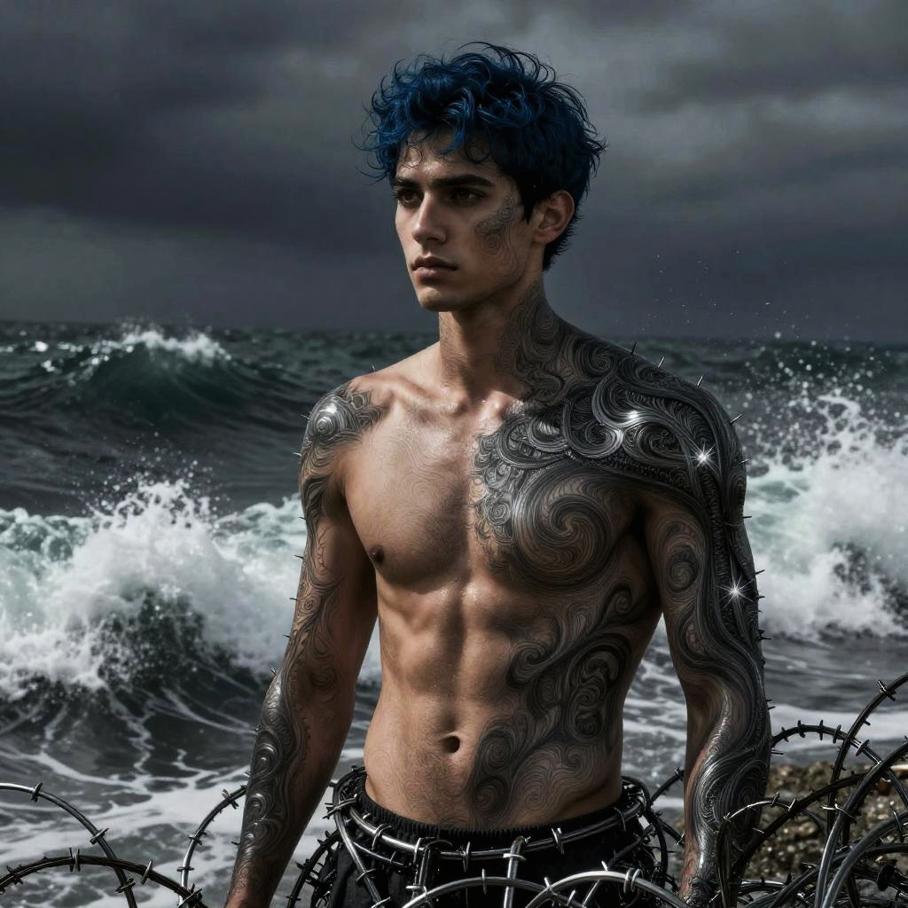 Realistic photo.ocean waves as a young man's skin, dark blue hair, brown eyes, full body, masterful shading, twisted steel wire, photorealistic, hyper-realistic details, dark and dramatic color tones, high contrast, intricate patterns, surreal atmosphere, ethereal lighting, haunting and enigmatic emotion, ultra-detailed, cinematic quality, high-resolution 4K, surrealist background, intricate textures, steel reflections. realistic photo