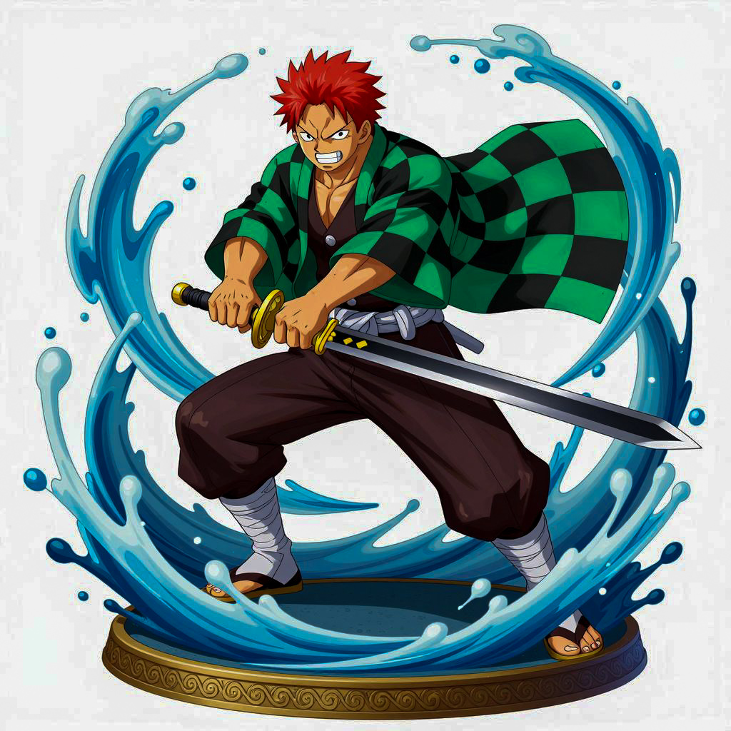 Anime-style illustration of a young male character with red spiky hair and intense expression, wielding a black sword. He wears a green and black checkered scarf, brown pants with white bandages on his legs, and red shoes. He's surrounded by dynamic, swirling blue water. His right arm is extended forward while his left arm is back, ready to strike. The base is detailed with an intricate pattern. He's in a mid-action pose, ready to attack. The background is dark, making the character and water stand out. There are no other characters.