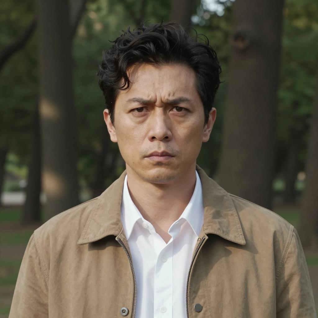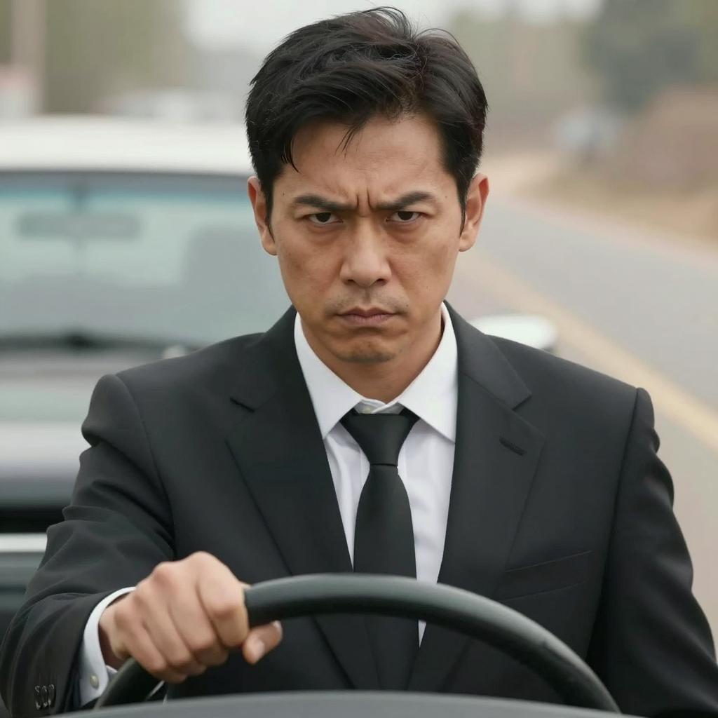Close-up of a serious Asian man with dark hair, wearing a black suit, white shirt, and black tie, gripping the steering wheel with his right hand. The background features a blurred, dusty road and another vehicle behind him. The man's intense gaze is directed forward as he drives.