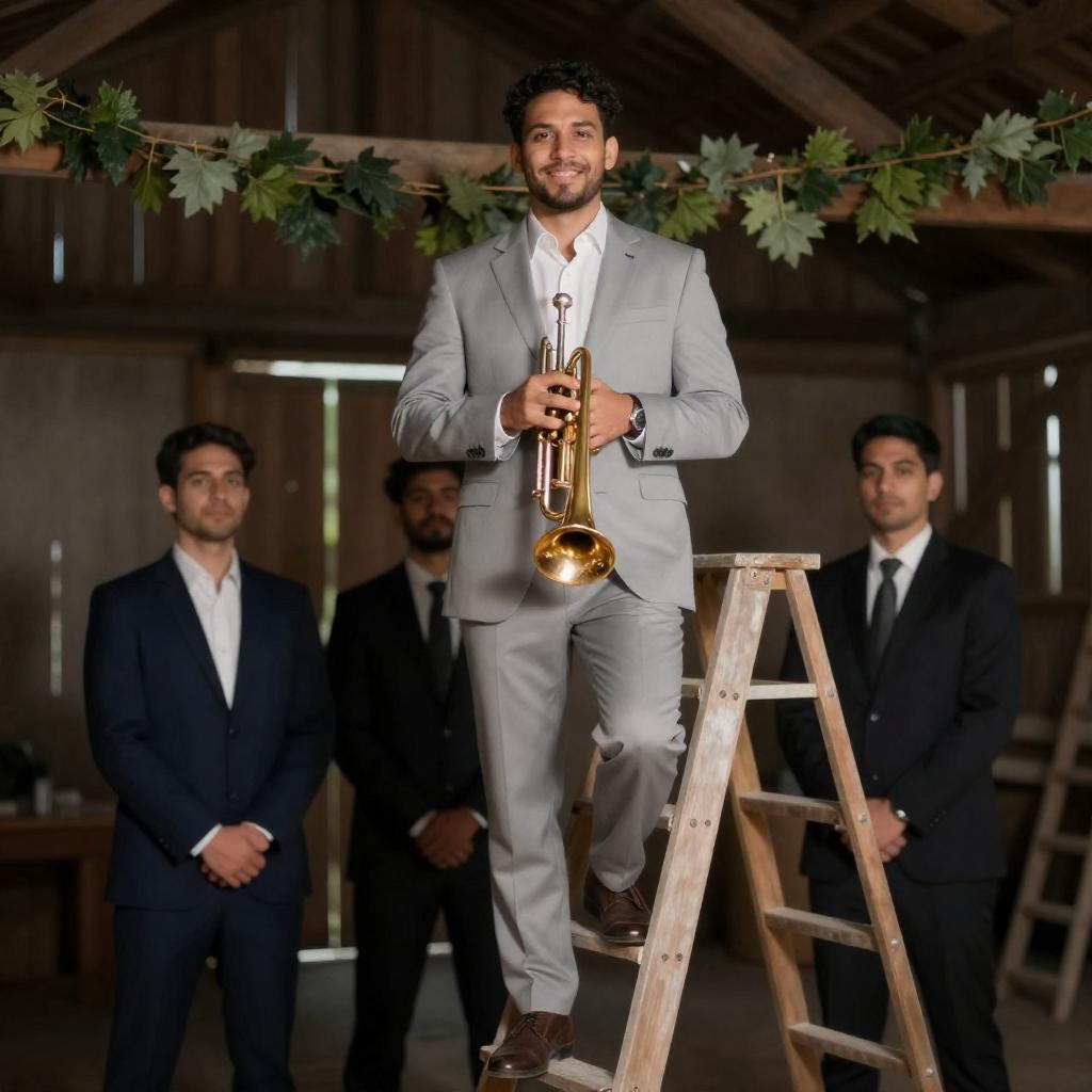 Photograph of a man in a light gray suit standing on a wooden ladder in a dimly lit, rustic barn. He holds a trumpet and smiles, with three men in dark suits standing behind him. Green leafy garlands hang across the background. The man is centered, with the ladder to his right.