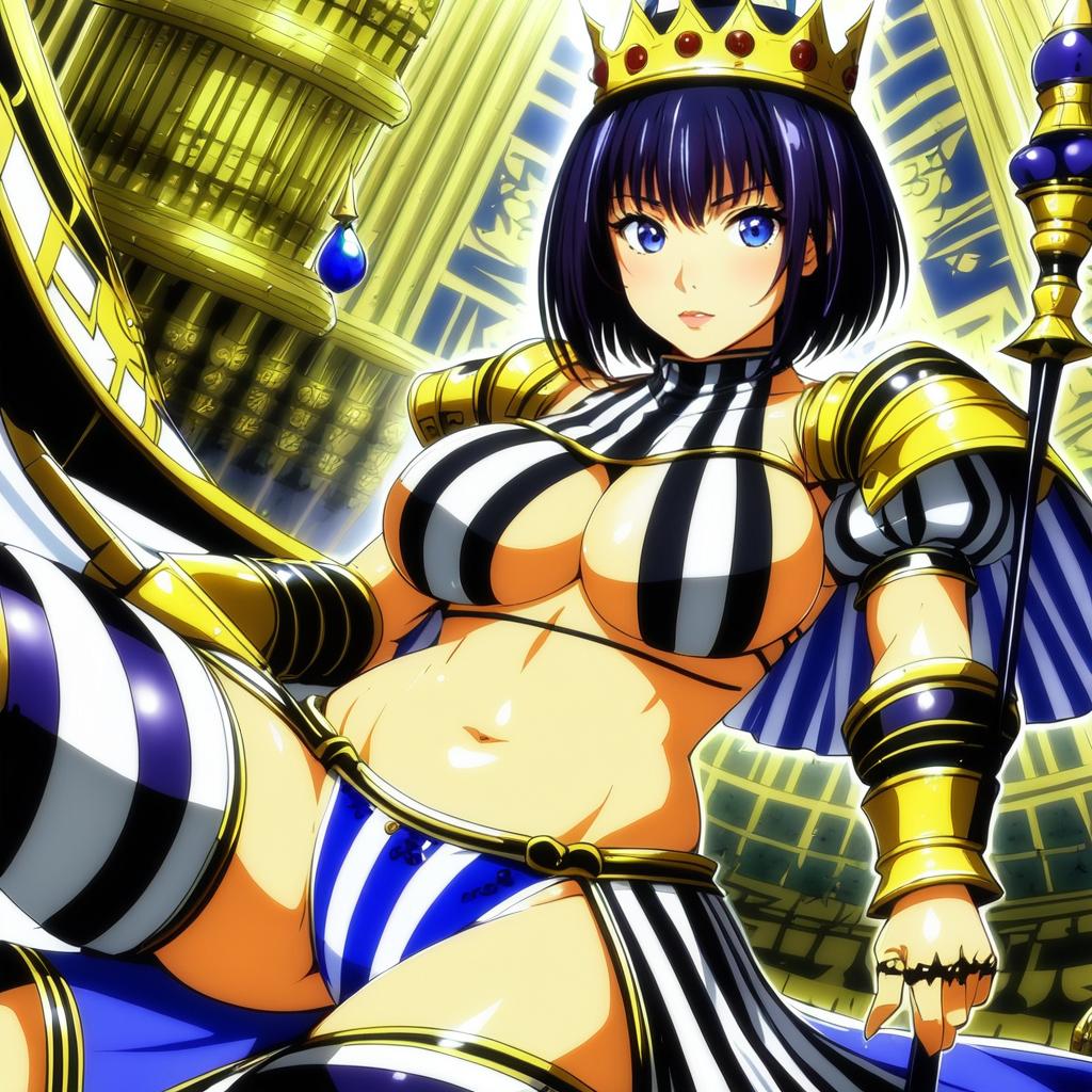 Ancient princess menace, queen's blade, 1girl, blue eyes, black hair, short hair, large breasts, underboob, navel, striped clothes, striped panties, revealing clothes, crown, by artist purin jiisan, illustrious