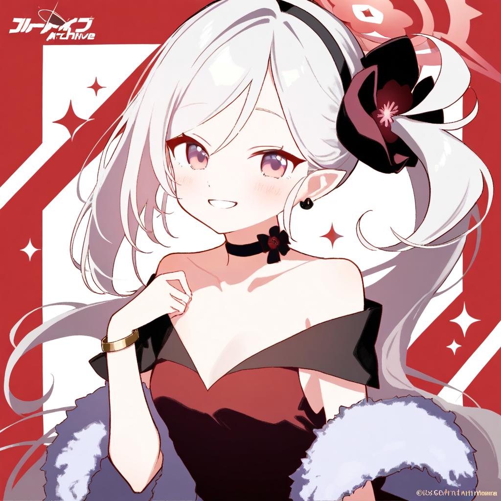 Mutsuki (dress) (blue archive), blue archive, 1girl, pointy ears, purple eyes, pink eyes, long hair, white hair, grey hair, black hairband, side ponytail, small breasts, collarbone, red dress, sleeveless dress, halo, red halo, bare shoulders, black choker, bracelet, earrings, white fur, shawl, by artist sofra, animagine