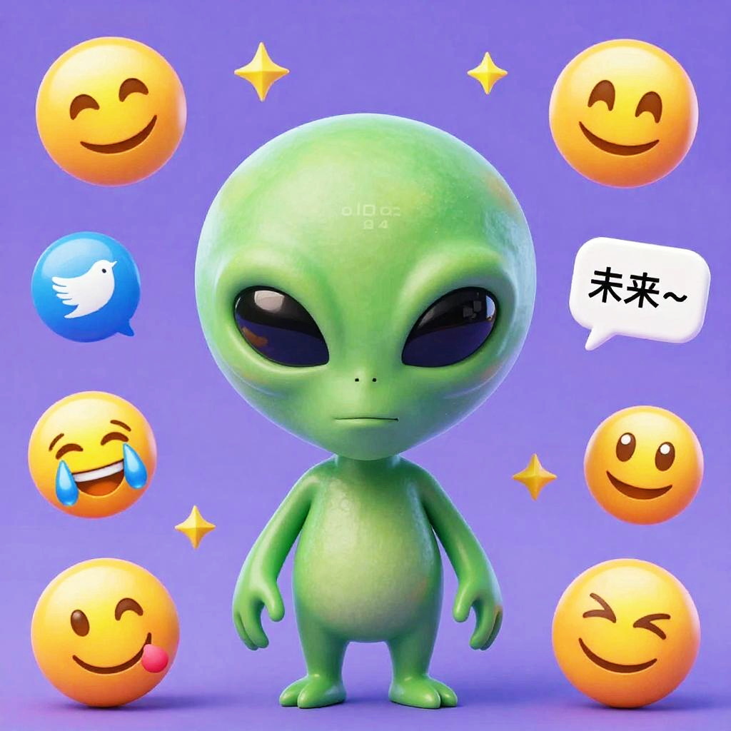 Alien meme 2023, a whimsical extraterrestrial character making a funny face in a meme style, surrounded by floating emoji icons and digital text bubbles, colorful and energetic graphic art, blending sci-fi and internet meme aesthetics