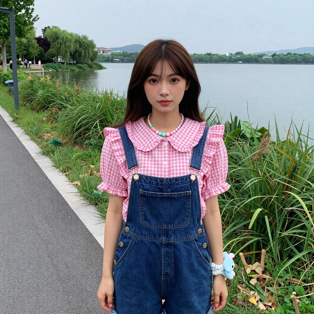 A slim woman in a kawaii style, wearing a ruffled pink gingham blouse with a Peter Pan collar and denim short overalls, accessorized with a pastel chunky bead necklace and a plush toy wrist accessory, stands at a lakeside promenade, surrounded by lush greenery and a serene water view. Sexy. Pretty face and beutiful eyes