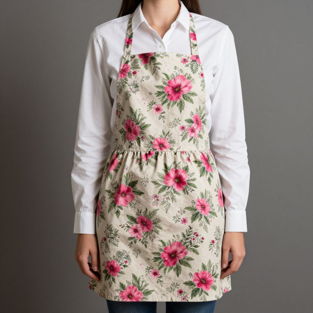 Woman wearing a tiered floral apron with a detachable bib, featuring vibrant pink flowers and green foliage on a cream background, paired with a crisp white long-sleeve shirt and blue jeans.