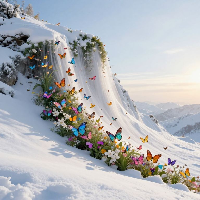 Imagine an enchanting digital artwork reminiscent of surrealist landscapes, where a colossal expanse of immaculate white snow ascends eternally towards the heavens. From this barren canvas, an enchanting haven emerges, a mesmerizing tapestry woven from countless iridescent butterflies in every color imaginable, gracefully dancing amidst verdant foliage and blossoming blooms. These delicate creatures form an ethereal veil that cascades down the snowy precipice, creating a dreamlike fusion of life and stillness. The scene is bathed in gentle, golden sunlight, casting elongated shadows across the snow and enveloping the captivating flora in warm, inviting illumination, thereby evoking a profound sense of wonder, serenity, and awe within the observer's soul.