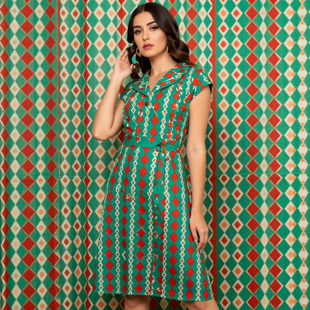 This vibrant fashion photograph features a woman elegantly dressed in a green and red geometric patterned dress, set against a matching patterned backdrop. The bold colors and unique design showcase a stylish retro aesthetic that captures attention.