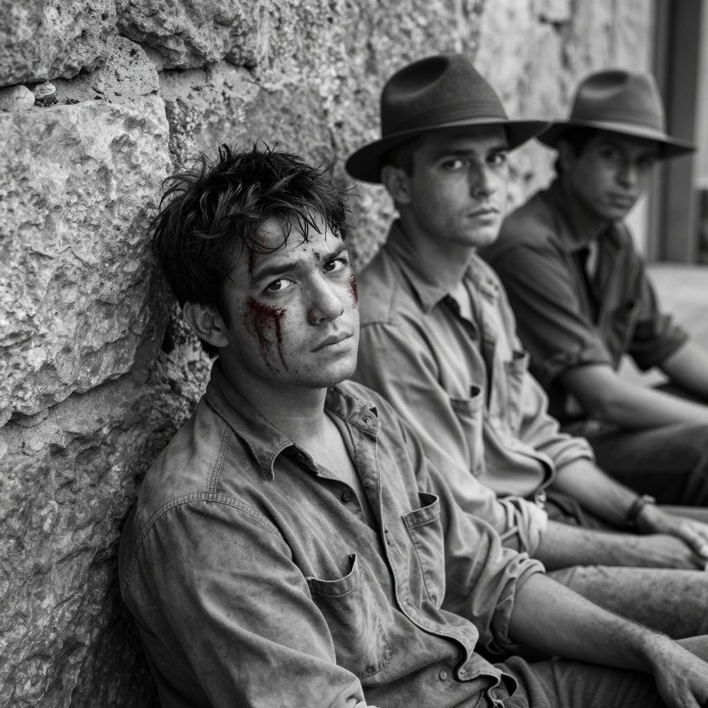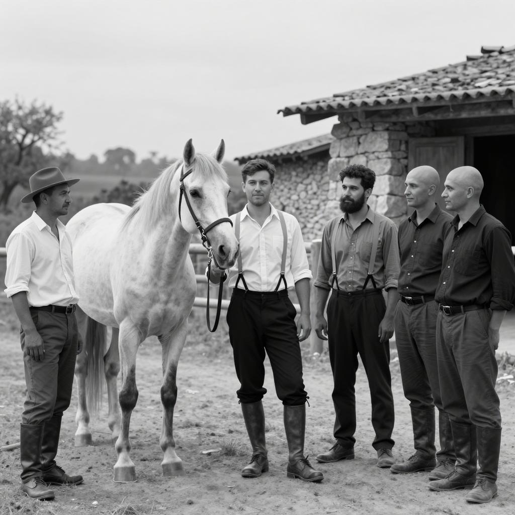 Black and white photograph of five men in a rustic outdoor setting. Four men stand to the right, one with a hat and short pants, another with a beard and suspenders, and two bald men in dark clothing. Central man holds a light-colored horse by the reins. Background includes stone structures and a wooden fence. Horse stands calmly, facing left.