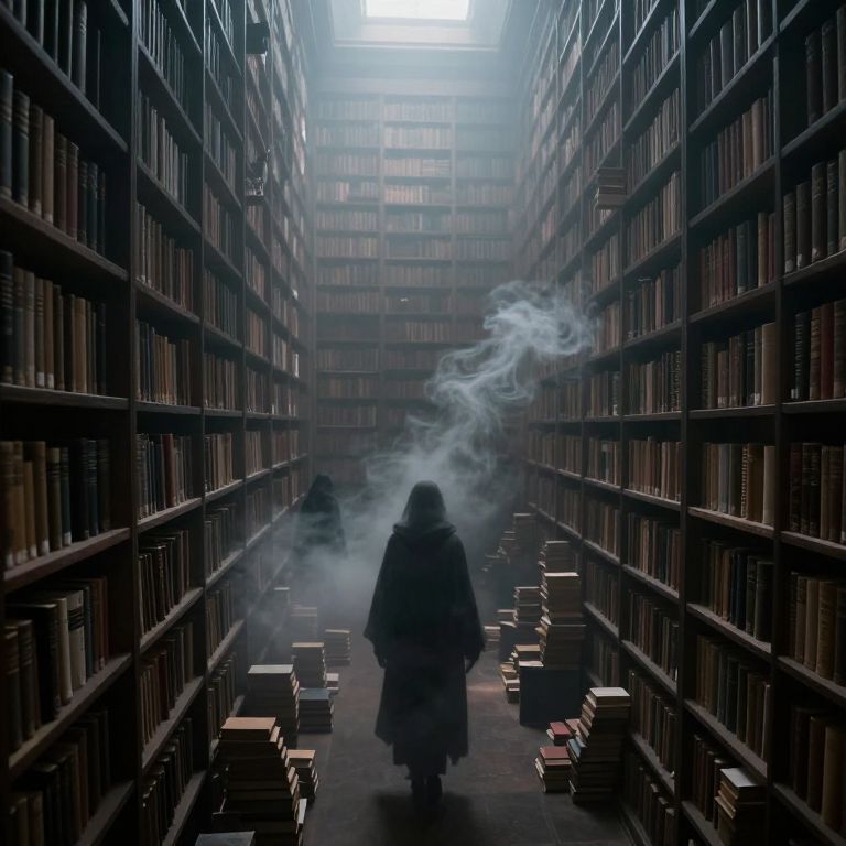 In a mist-shrouded library where shelves stretch endlessly into the void, cloaked figures drift among the books, their forms dissolving into tendrils of smoke as they navigate this ethereal realm of knowledge and mystery.