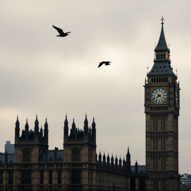 Photograph of the silhouetted Palace of Westminster with Big Ben clock tower, three birds flying against a cloudy white sky.