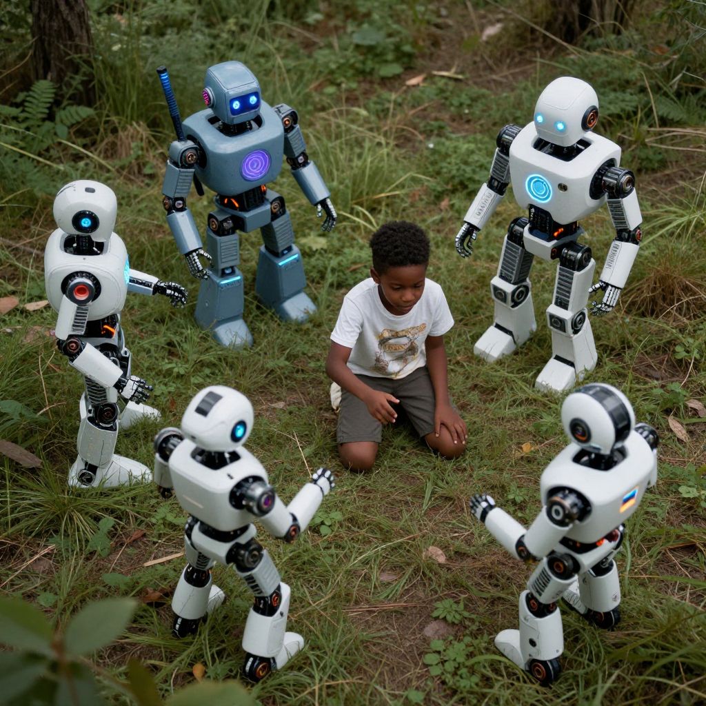 Photograph of a young Black boy, around 5-7 years old, kneeling on grassy forest floor, wearing a white t-shirt with a graphic design and gray shorts. Surrounding him are five small, white and blue robot toys, each with black accents and glowing blue or purple eyes, standing in a semi-circle. The robots are various shapes and sizes, with the tallest one in the background and the shortest in the front. The forest background includes green grass, small plants, and tree trunks, creating a natural and playful outdoor setting. The boy has short, curly black hair and a focused expression.