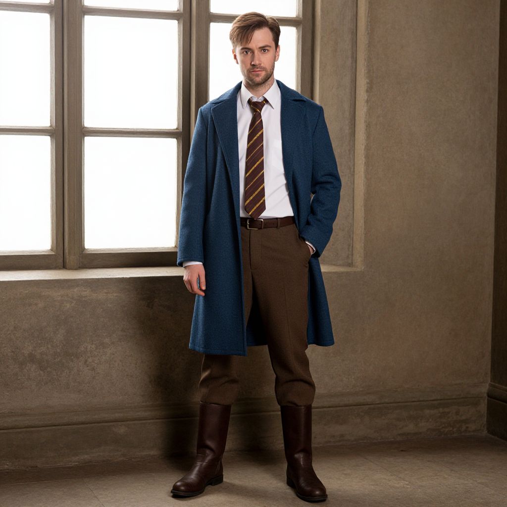 Professor mcgonagall costume, 1boy, male focus, solo, pants, coat, window, hand in pocket, shirt, standing, boots, necktie, collared shirt, brown footwear, full body, white shirt, indoors, vest, facial hair, brown pants, blue coat, looking at viewer, long sleeves, realistic