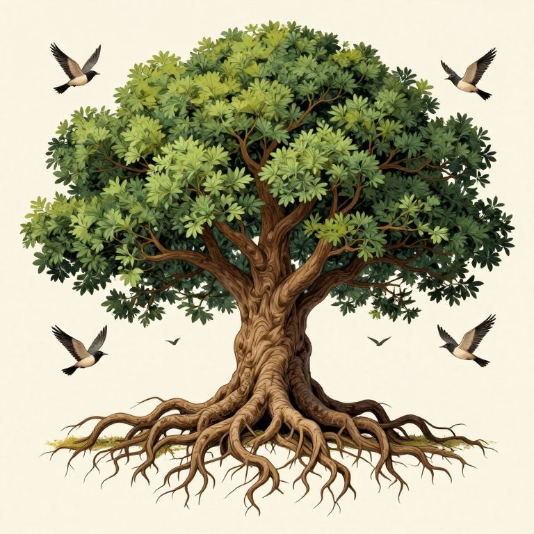 Illustration of a large, leafy tree with intricate, twisting roots, surrounded by five birds in flight, set against a white background.